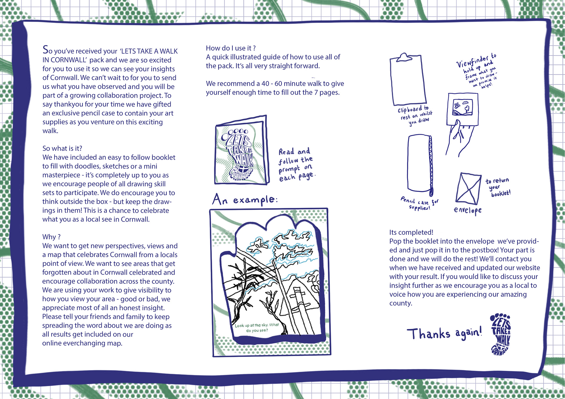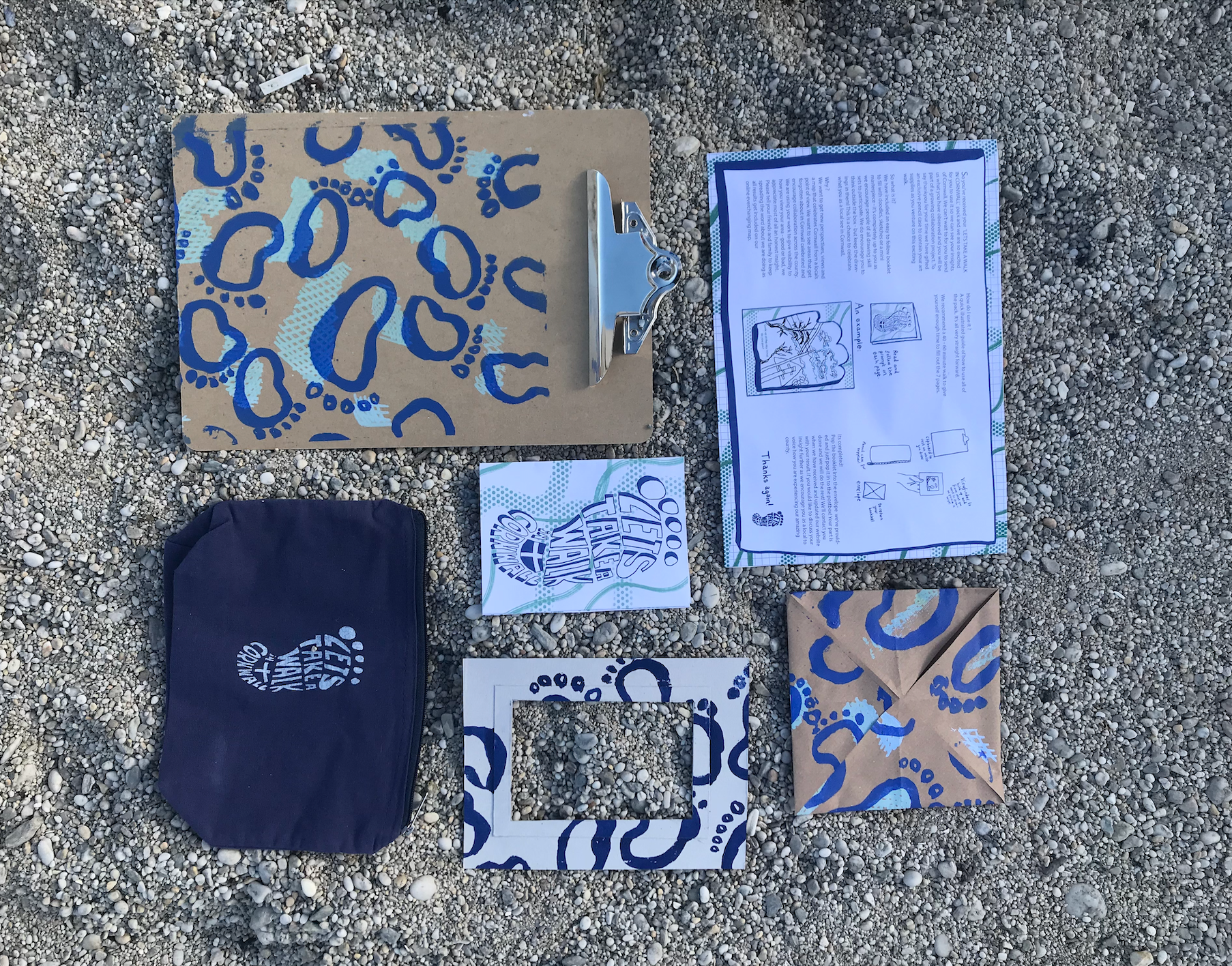 A collaborative branding project encouraging drawing and observation of your environment as you walk around Cornwall. Participants are encouraged to post their results on social media to generate publicity and the results are added to a wide map of Cornwall documenting every area. These drawstring bags were screen printed in my garage and are available to buy.